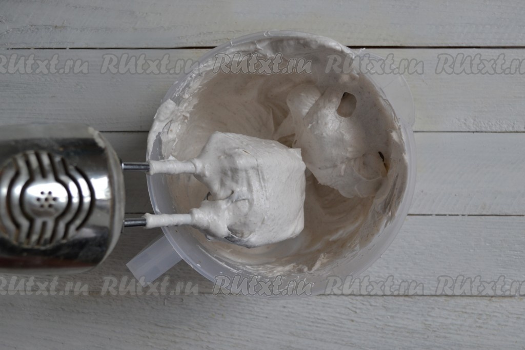 Начиная со слабых оборотов миксера, постепенно увеличивая скорость, взбить банановое пюре с белком в пышную, устойчивую светлую массу. Взбивать до тех пор, пока масса не станет "схватываться" (приподняв венчик, банановый крем останется на нем, как на фото).