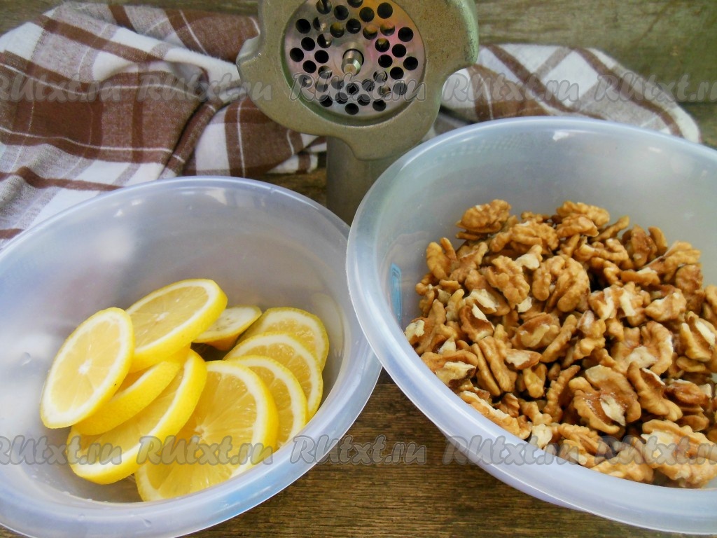 Лимон залейте горячей водой, оставьте на 3-5 минут. Затем воду слейте, лимон хорошо промойте, нарежьте на колечки, удалите косточки. Грецкие орехи и лимон пропустите через мясорубку.