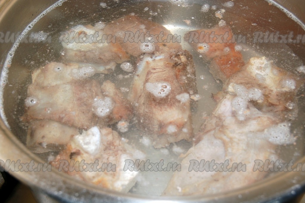 В кастрюлю, в которой будете варить харчо, выложить обжаренные говяжьи рёбрышки, залить 2,5 литрами холодной воды, поставить на сильный огонь. После закипания воды, убрать с поверхности пену, уменьшить огонь и варить рёбрышки 1-1,5 часа (до мягкости мяса).