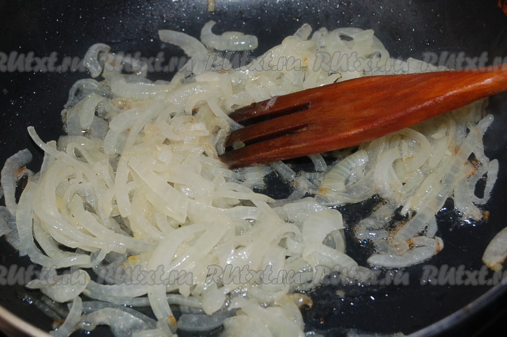 Репчатый лук очистить, нарезать на тонкие полукольца, выложить на сковороду, на которой обжаривалось мясо, если нужно, добавить ещё немного растительного масла. Обжарить лук на среднем огне в течение 3-4 минут (до мягкости), периодически перемешивая.