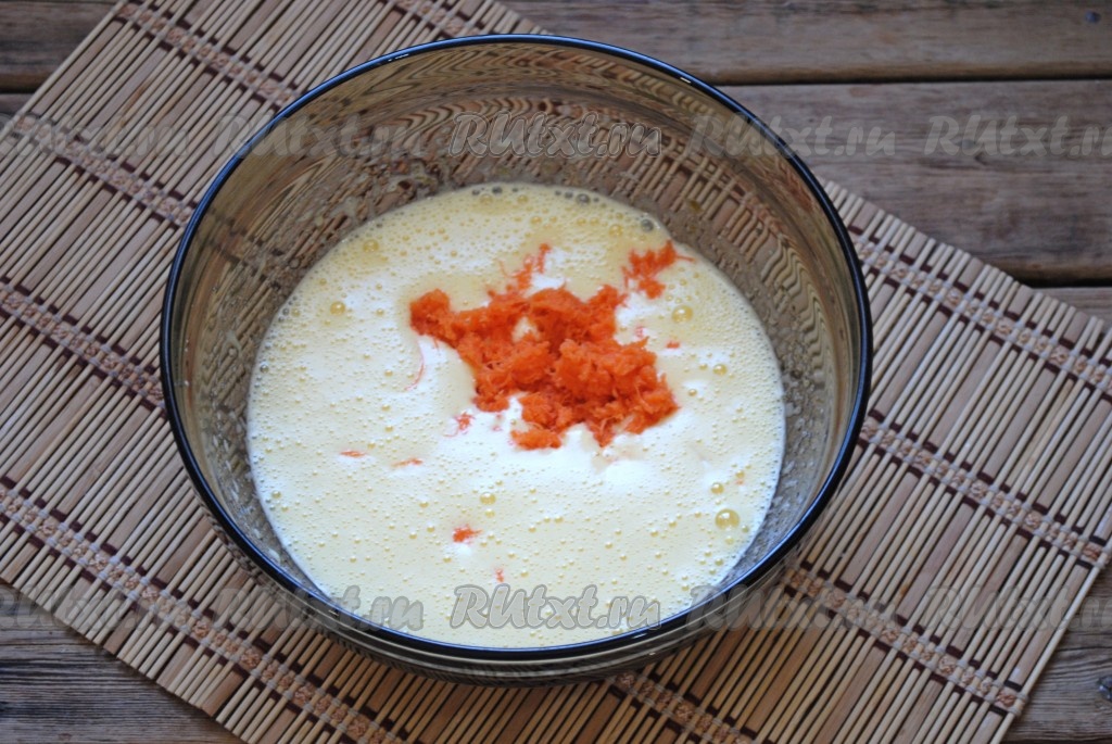 Очищенную морковь натереть на самой мелкой тёрке. В яичную смесь добавить запенившуюся опару и натёртую морковь.