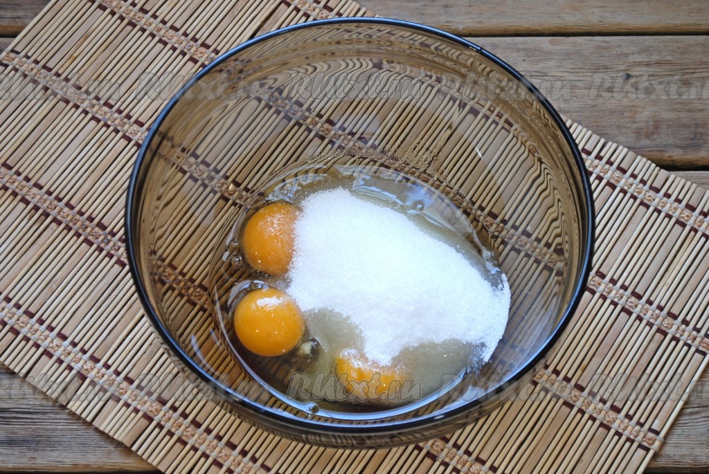 Для замешивания теста нужно в объёмную миску вбить яйца и сахар.