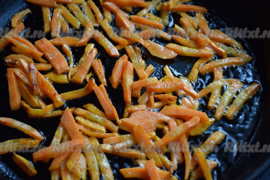 В сковороде разогреваем растительное масло. Кладем в разогретую сковороду морковь и обжариваем ее на небольшом огне, помешивая, до подрумянивания.