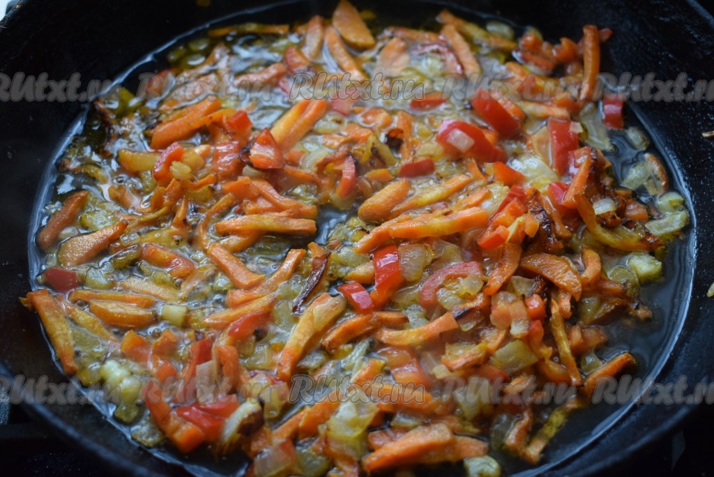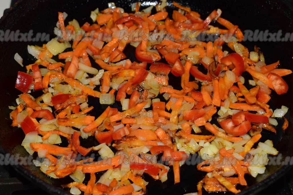 К моркови добавляем лук и болгарский перец, обжариваем овощи, помешивая, до готовности лука и перца (примерно, 5-7 минут).