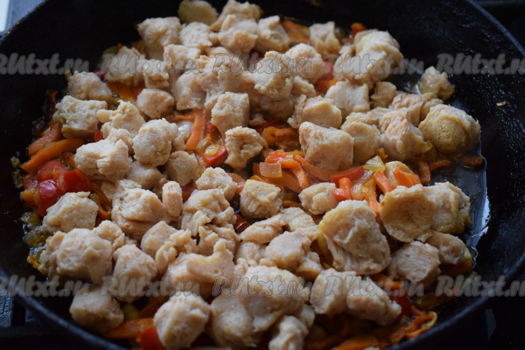 К тушеным овощам добавляем подготовленное соевое мясо.