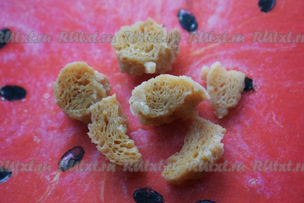 Готовность соевого мяса для дальнейшего приготовления проверяем следующий образом: берем кусочек мяса и разрезаем его пополам, внутри кусочка не должно остаться сухого места, весь кусочек должен быть равномерно пропитан влагой.