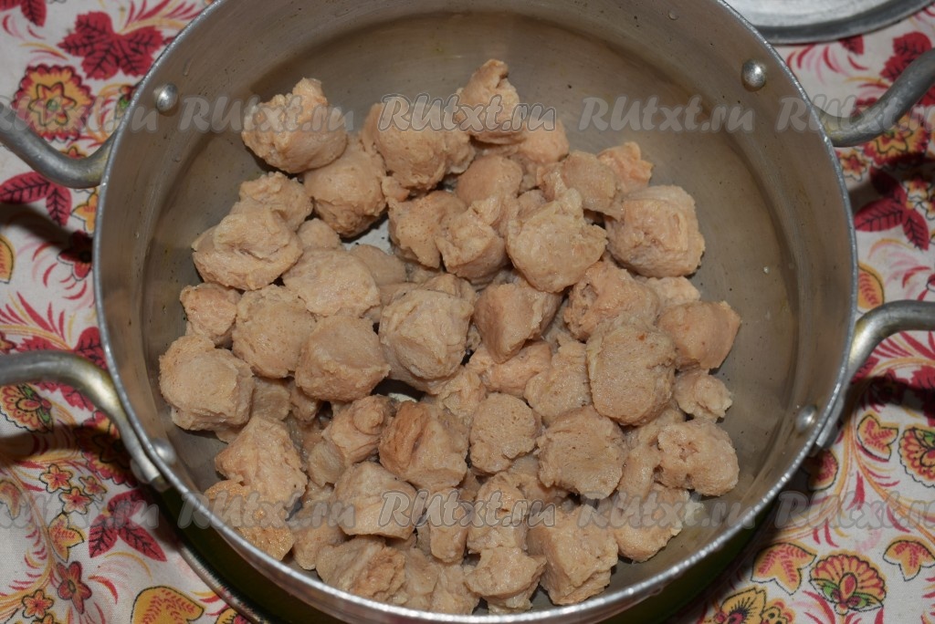 Заливаем кусочки соевого мяса кипятком (соотношение воды к мясу: 2 части кипящей воды к 1 части мяса).