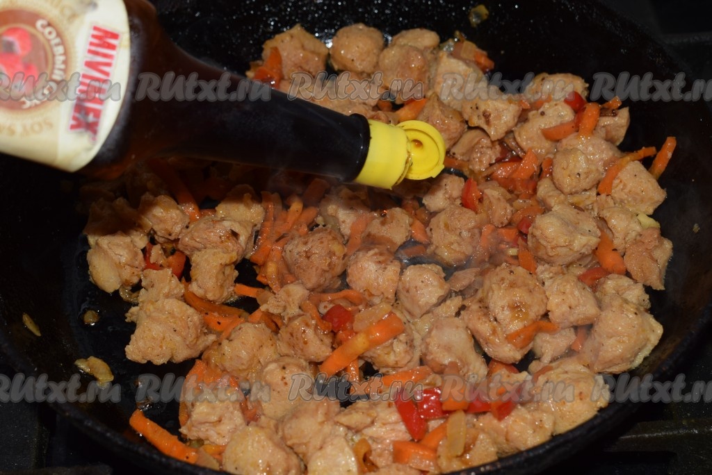 Солим, перчим, добавляем кориандр, хмели-сунели и поливаем соевым соусом по вкусу.