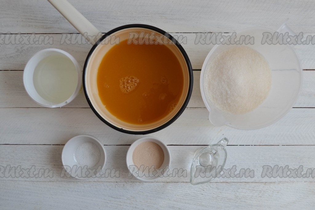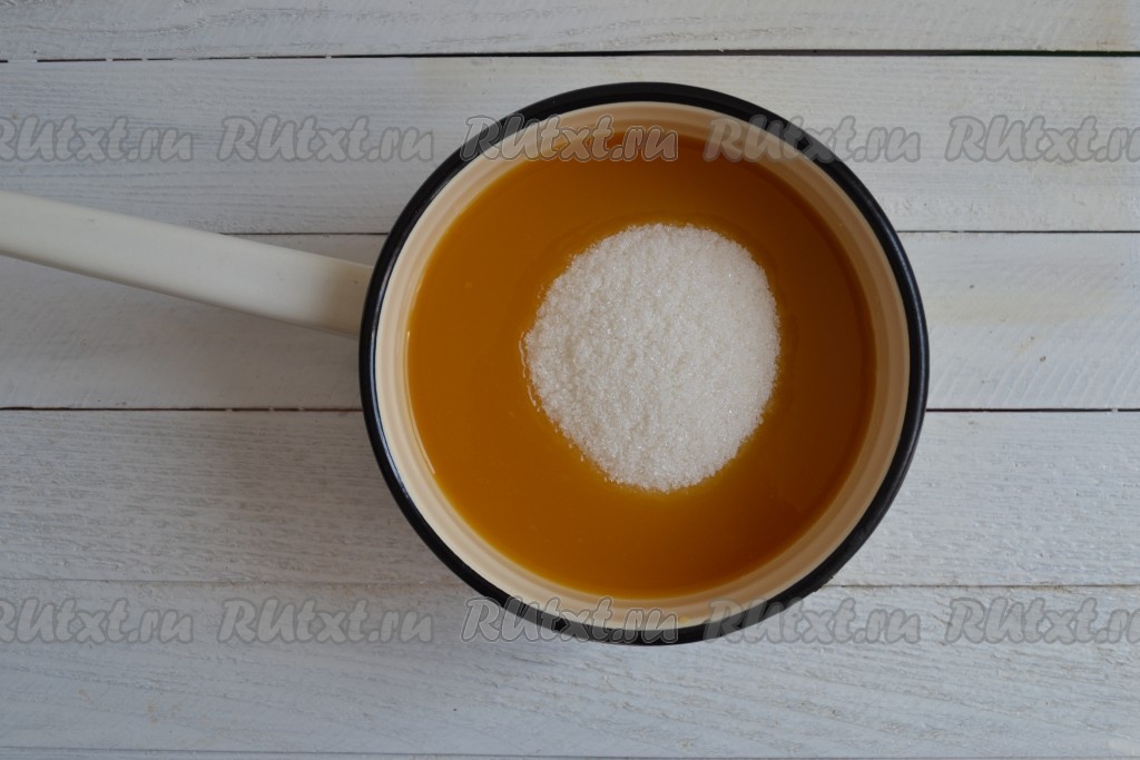 В сотейник влить сок с мякотью (я использовала натуральный персиковый сок), влить сироп глюкозы и всыпать оставшиеся 500 грамм сахара.