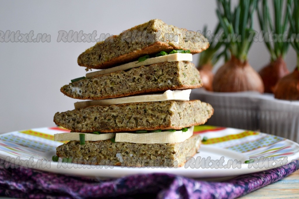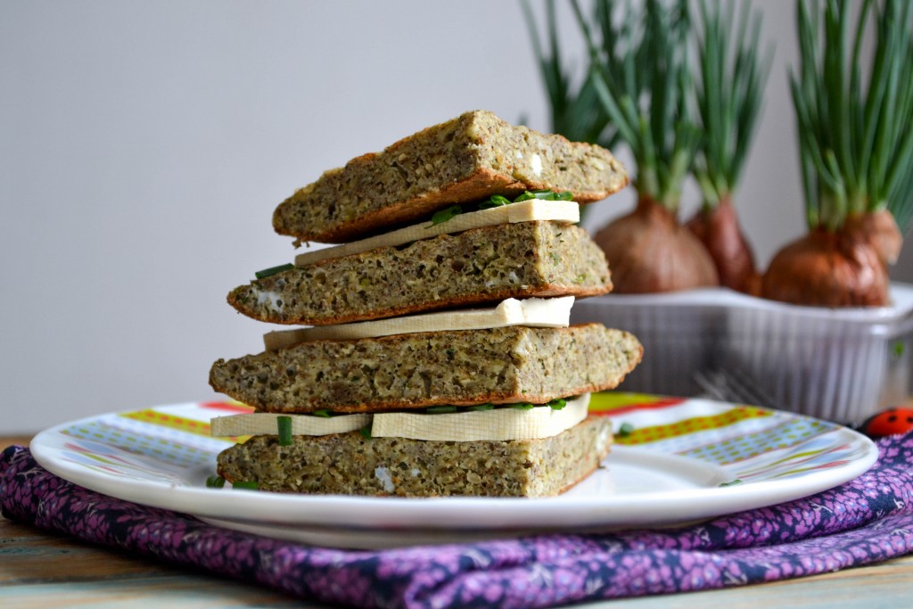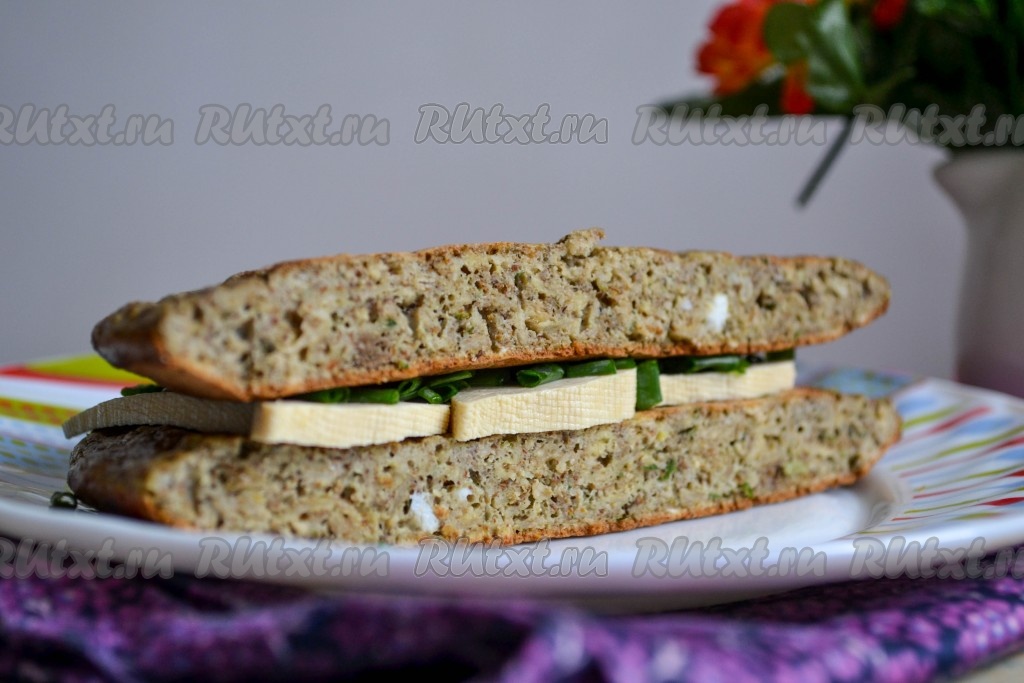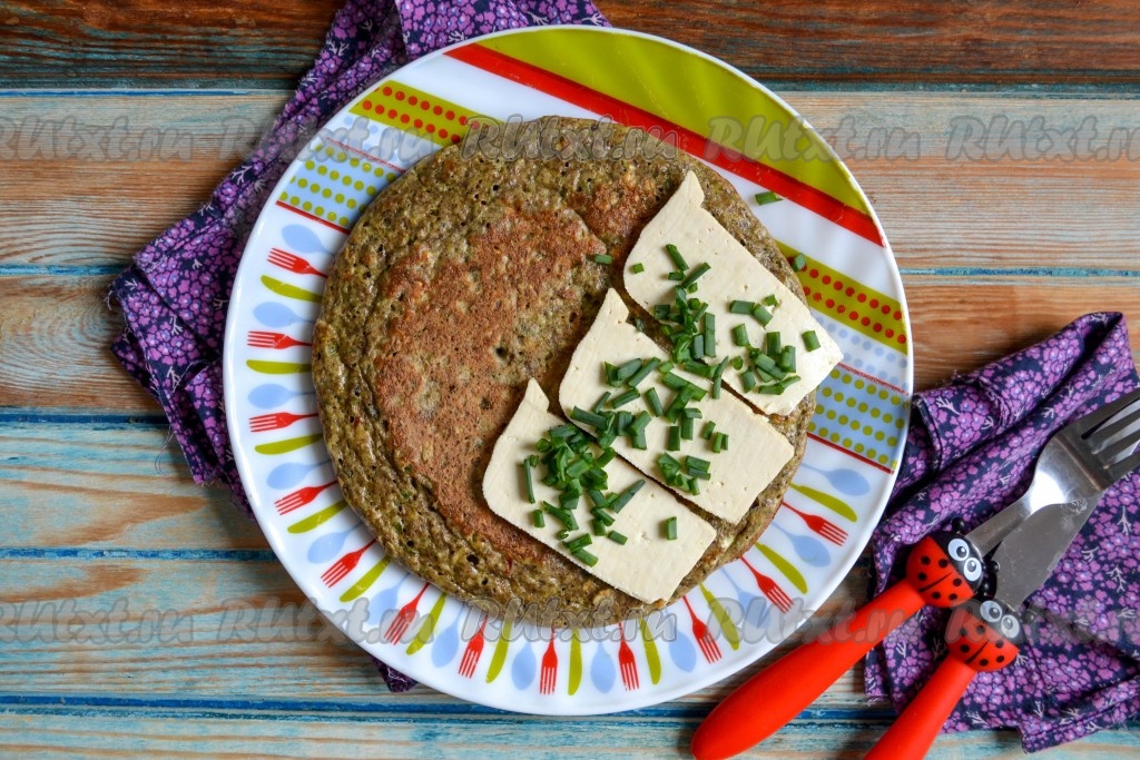Сочный, нежный, ароматный овсяноблин готов. Подать его можно с сыром и зеленью. Для этого овсяноблин нужно выложить на блюдо, а сверху на одну сторону разместить ломтики сыра, посыпать измельченной зеленью. Я использую сыр тоффу, а вы выбирайте сыр на свое усмотрение - твердый или мягкий. На что следует обратить внимание, так это на содержание соли, если сыр солоноватый, то не добавляйте тогда соль в само тесто.