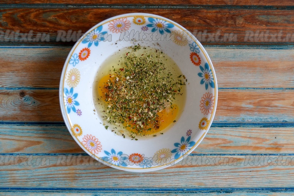 В миску выложить два куриных яйца, добавить соль и прованские травы. По желанию, можно добавить свои любимые приправы и специи.