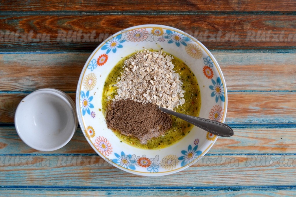 Всыпать овсяные хлопья и отруби. Овсяные хлопья подойдут любые. Но, если все же вы используете крупные, то готовое тесто нужно оставить минимум на 5 минут, чтобы хлопья размокли. А если на это нет времени, их можно заблаговременно измельчить кофемолкой или блендером. Отруби тоже подойдут разные. Я использовала отруби расторопши.