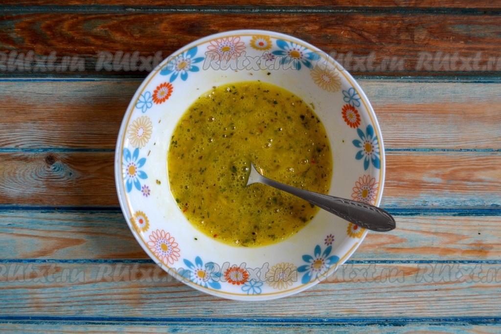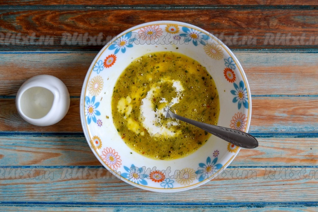 Расколотить яйца вилкой, как на омлет. Взбивать в пышную массу, используя миксер, не надо.