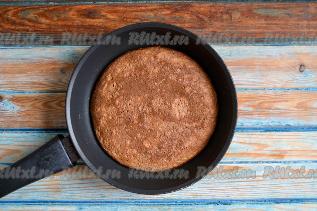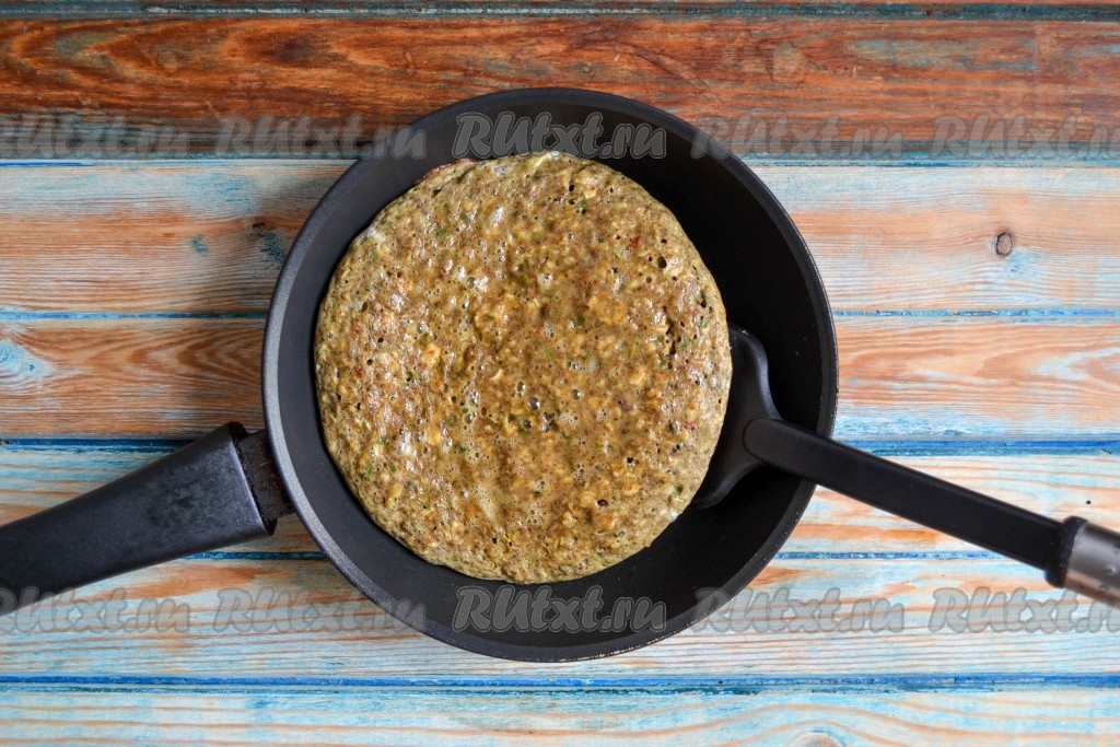 Сковороду разогреть, смазать оливковым маслом, огонь снизить к минимуму и влить подготовленное тесто. Тесто будет средней густоты, текучим, равномерно распределится по поверхности сковороды. Крышкой накрывать не нужно.