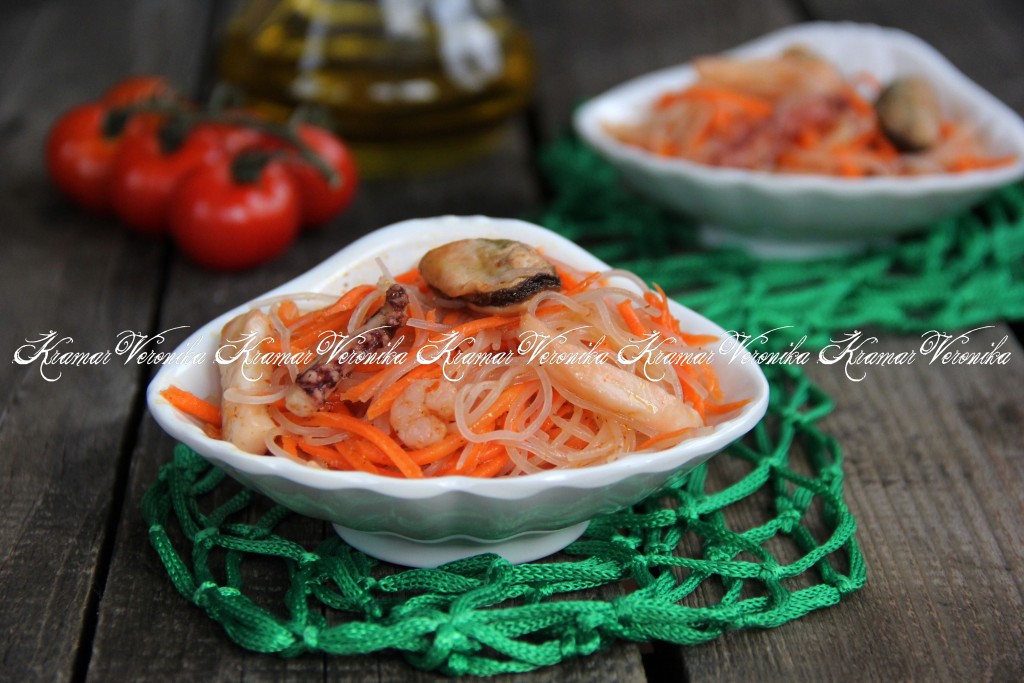 Хочу поделиться простым рецептом приготовления салата с фунчозой и морепродуктами. Для этого блюда я использую замороженный "морской коктейль". Салатик получается в меру острым, очень вкусным и ярким. Любителям морепродуктов это блюдо, наверняка, понравится.