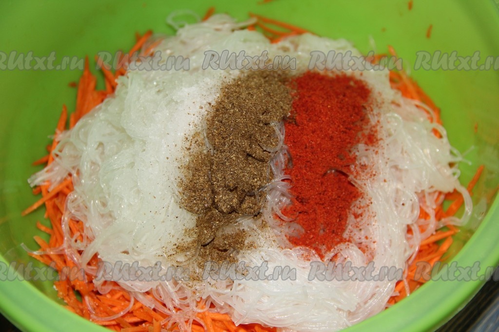 Соединить в большой миске морковь, фунчозу, соль, паприку и приправу для моркови.