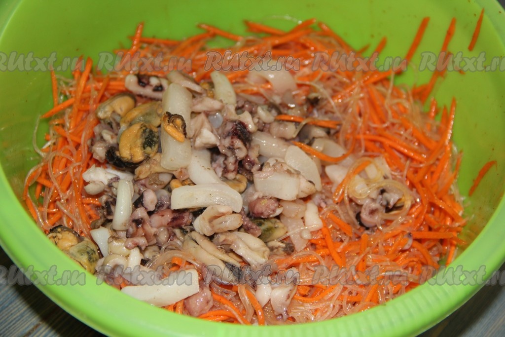Тщательно перемешать морковь, фунчозу и специи. Добавить морепродукты, уксус, масло и соевый соус. Хорошо перемешать салат, закрыть плотно крышкой или тарелкой и оставить на ночь в холодильнике.
