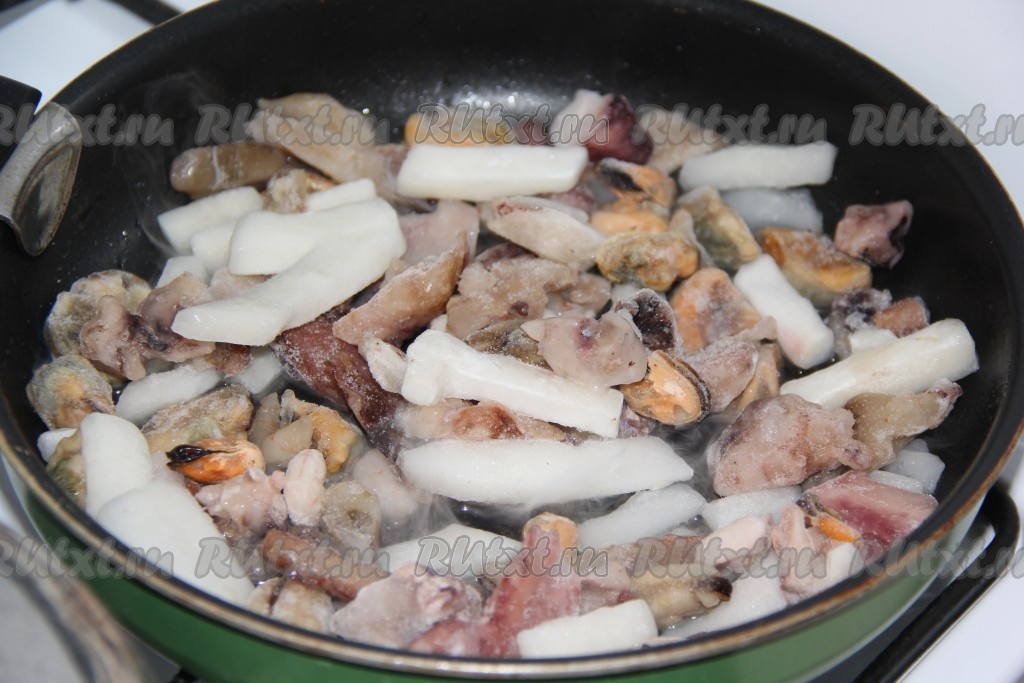 Морепродукты, предварительно не размораживая, выложить на сковороду, тушить на небольшом огне в собственном соку минут 5, иногда помешивая.