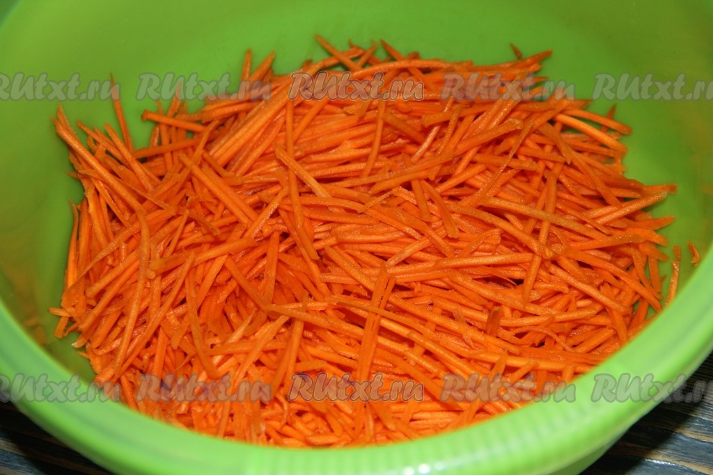 Натереть на тёрке для моркови по-корейски очищенную морковь.