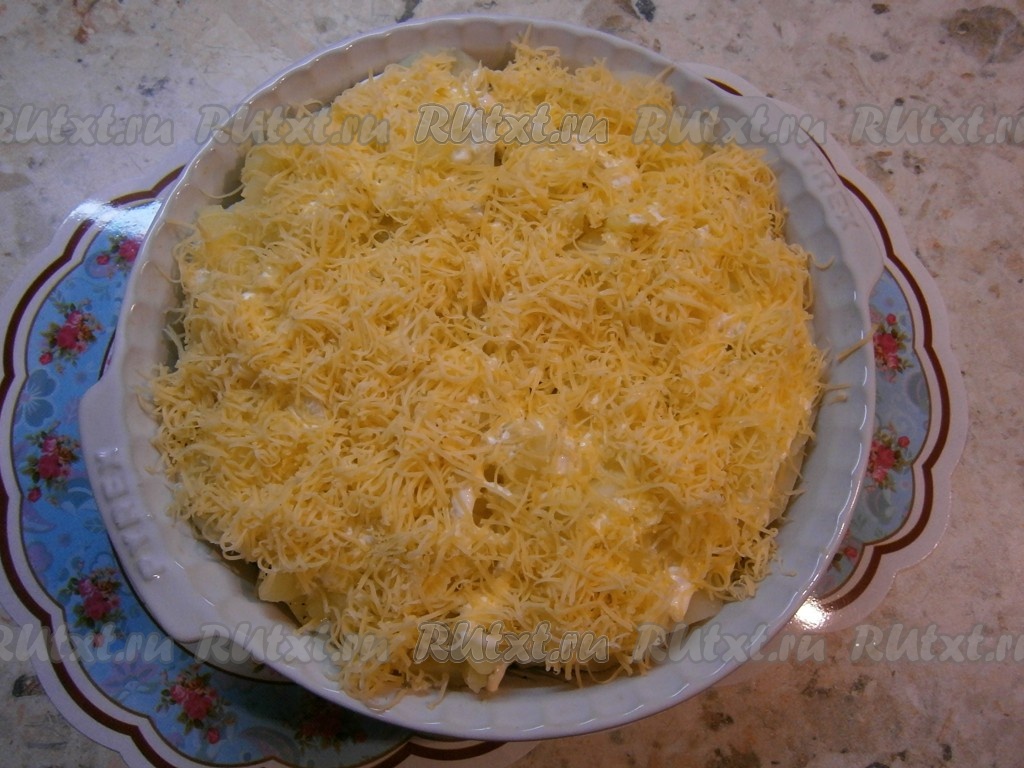 Сыр натереть на средней терке и посыпать им все сверху.
