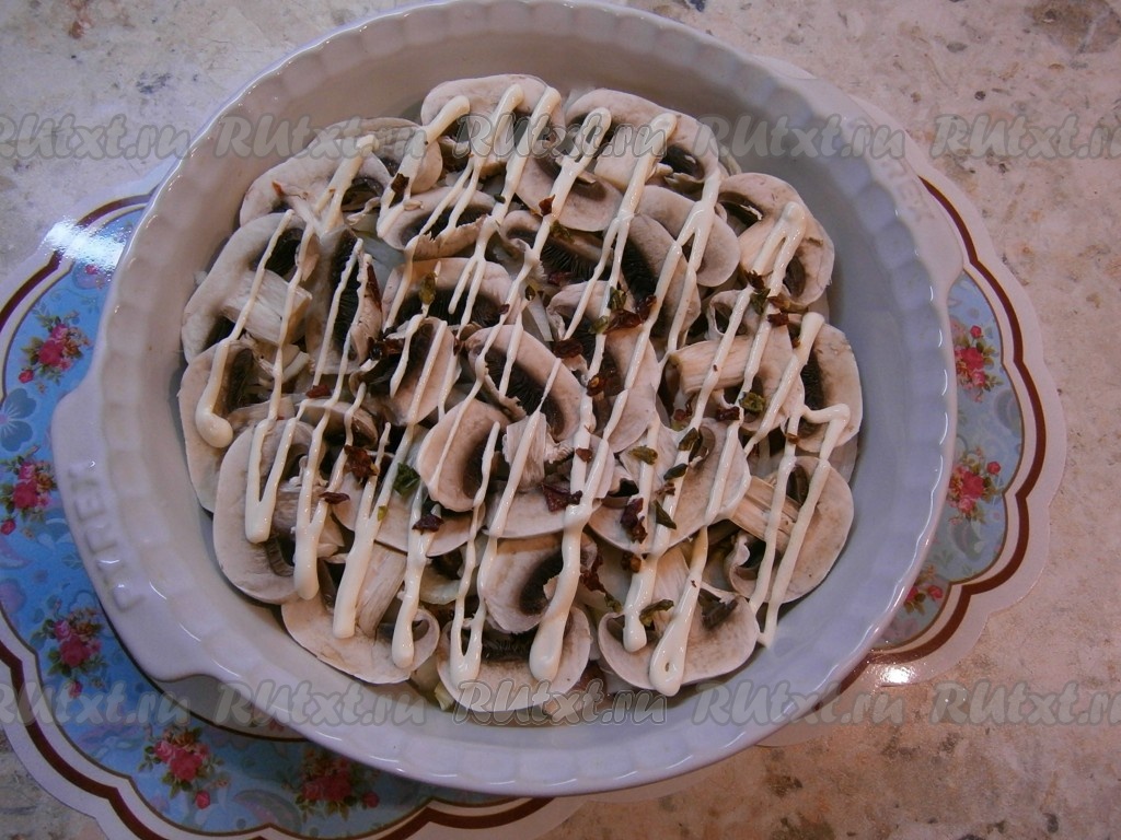 Шампиньоны нарезать пластинами и выложить их следующим слоем, посолить и немного смазать майонезом.