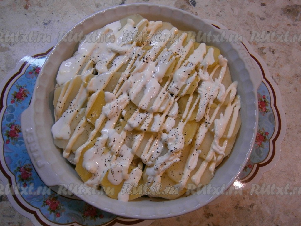 Картофель откинуть на дуршлаг, дать ему остыть до теплого состояния и выложить сверху грибов. Немного еще посолить картошку, смазать щедро сметаной и майонезом, поперчить.