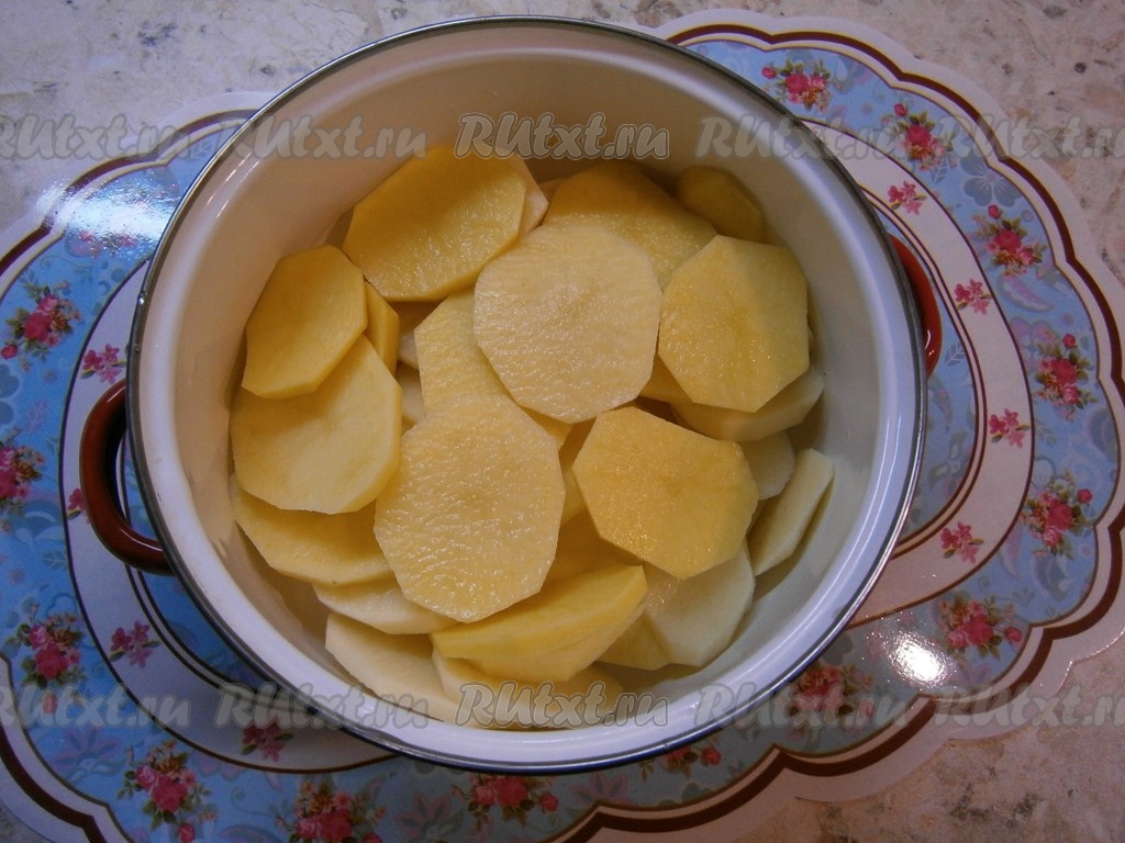 Картофель очистить, нарезать тонкими кружочками, поместить в кастрюлю.