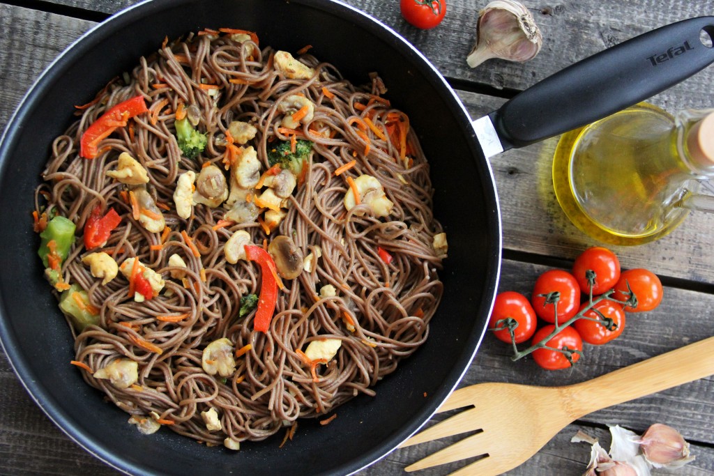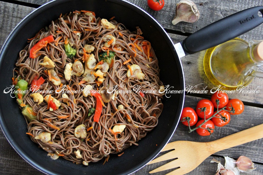 Вот так просто и достаточно быстро можно приготовить гречневую лапшу с курицей и овощами. Блюдо получается очень вкусным и сытным, к столу подаём в горячем виде.
