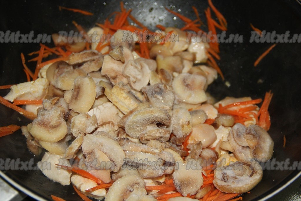 Обжарить грудку с морковью на среднем огне в течение 5-7 минут, периодически помешивая. Затем добавить шампиньоны, нарезанные на пластины (я использовала замороженные грибы и предварительно не размораживала), обжаривать в течение 5 минут, помешивая.