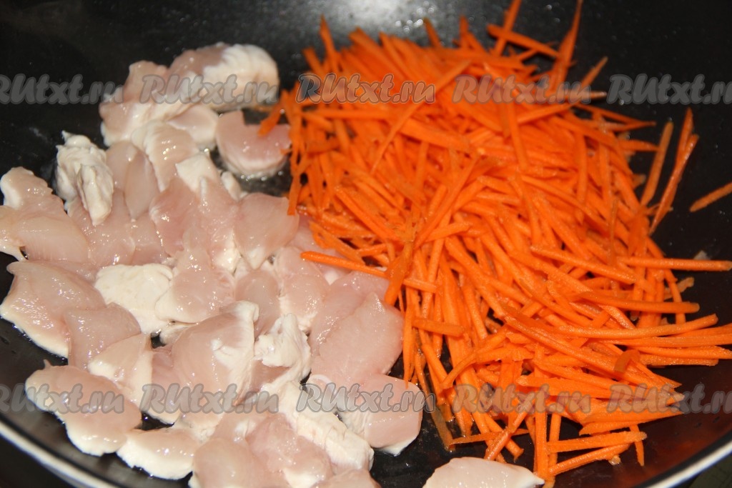 В сковороду с высокими бортиками добавить масло, хорошо нагреть и выложить нарезанную куриную грудку и натёртую морковь.