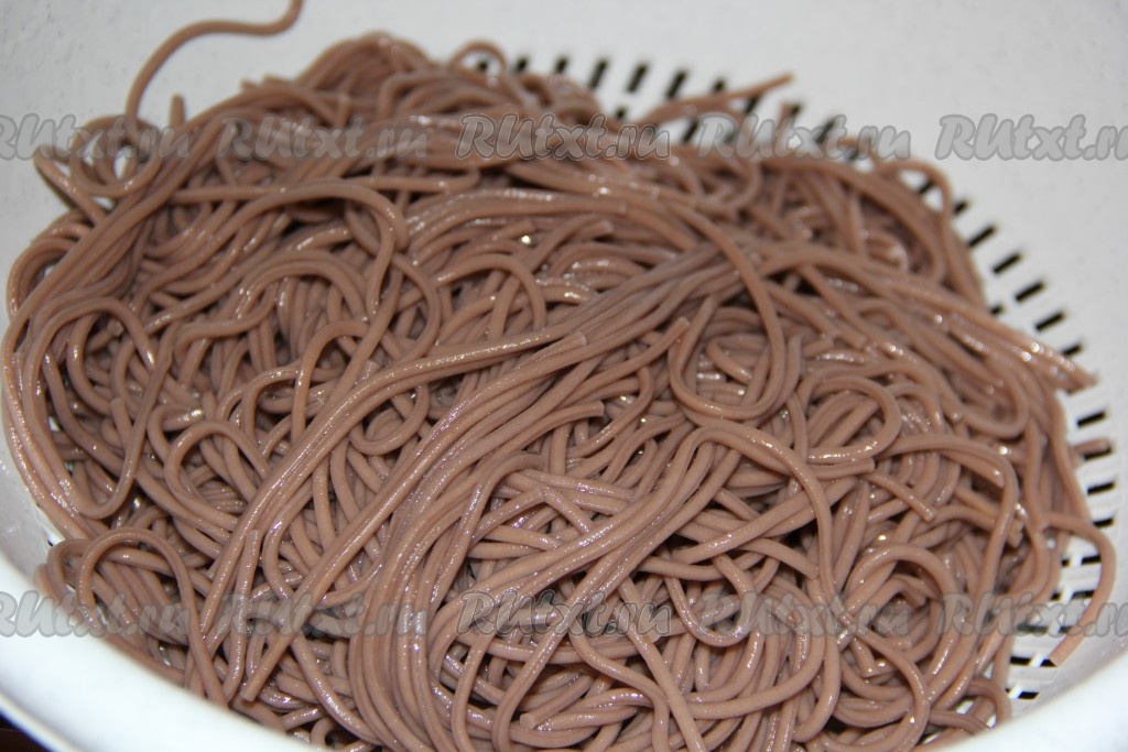 Готовую гречневую лапшу откинуть на дуршлаг и промыть холодной водой.
