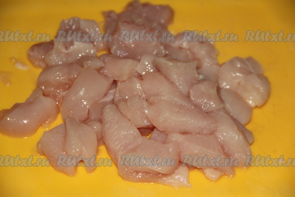Куриную грудку нарезать на небольшие кусочки. Слишком мелко нарезать не надо, но и очень крупными кусочки мяса не должны быть.
