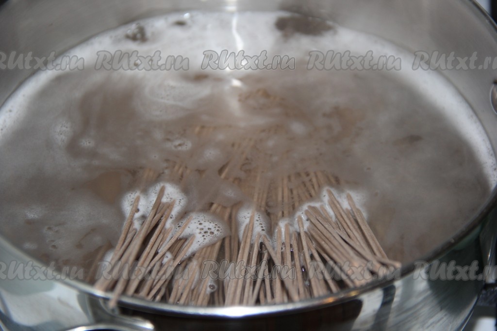 Вскипятить воду для приготовления лапши, добавить соль. Опустить гречневую лапшу в кипящую воду и варить 2-3 минуты с момента закипания на небольшом огне.