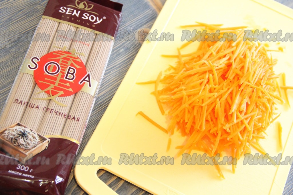 Морковь очистить и натереть на тёрке для моркови по-корейски.