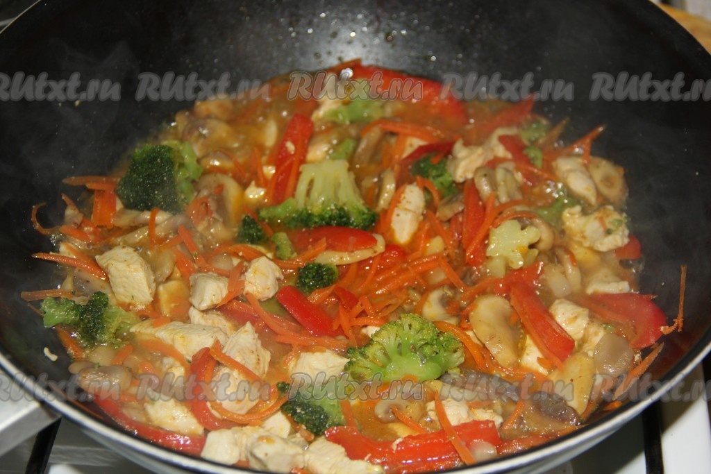 Добавить перец и брокколи в сковороду. Обжаривать овощи и грудку в течение 10 минут на небольшом огне, иногда перемешивая.