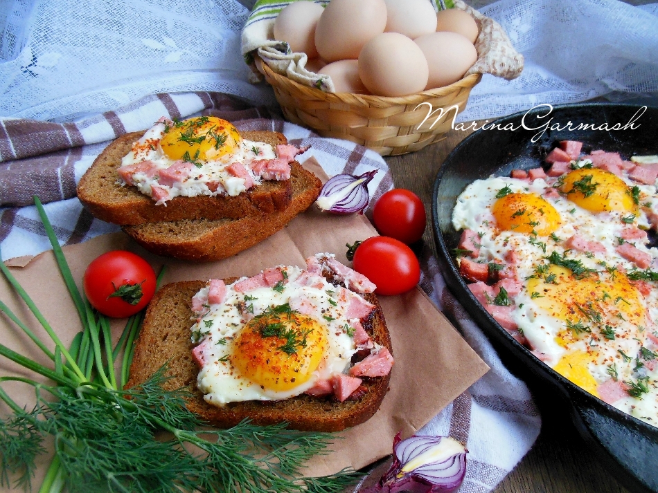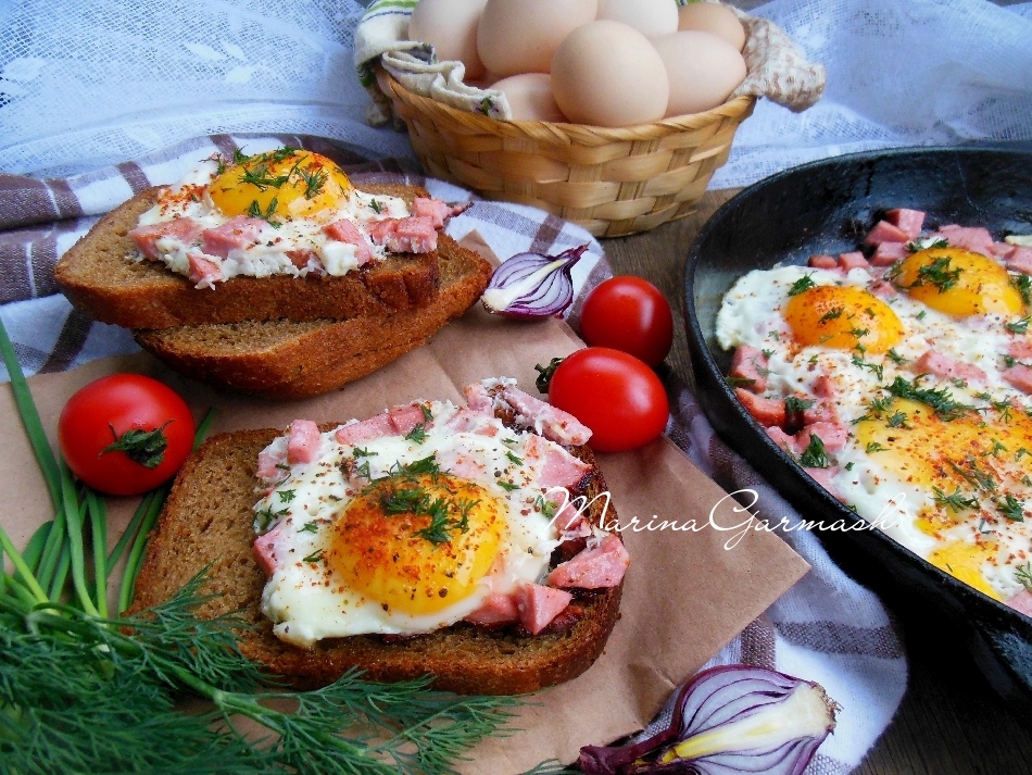 Вбейте в сковороду с обжаренной колбасой куриные яйца, стараясь сохранить целостность желтка.