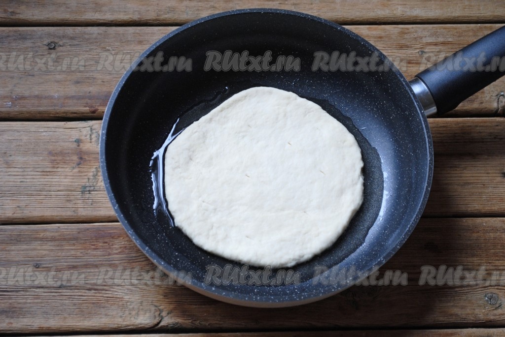По истечении времени обмять тесто и разделить его на пять равных частей. Каждую часть теста раскатать в лепёшку толщиной около 0,5 см. По всей поверхности каждой лепёшки ножом или вилкой сделать проколы. Сковороду с растительным маслом хорошо разогреть, выложить лепёшку.
