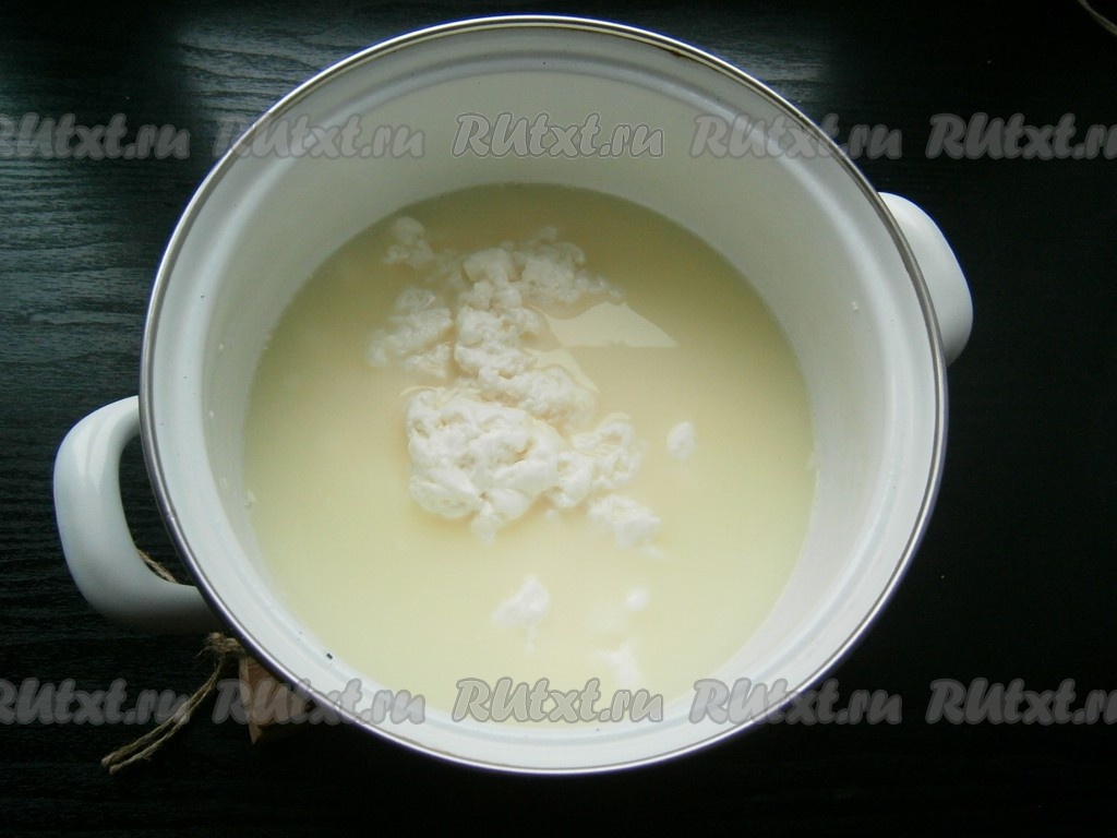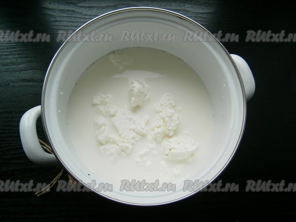 Поставить посуду с молочно-творожной смесью на средний огонь и при периодическом помешивании довести до кипения. Далее варить на слабом огне до отделения сыворотки. Возможно, понадобится минут 5. У меня сыворотка отделилась, как только смесь начала закипать. Сразу снять ее с огня.