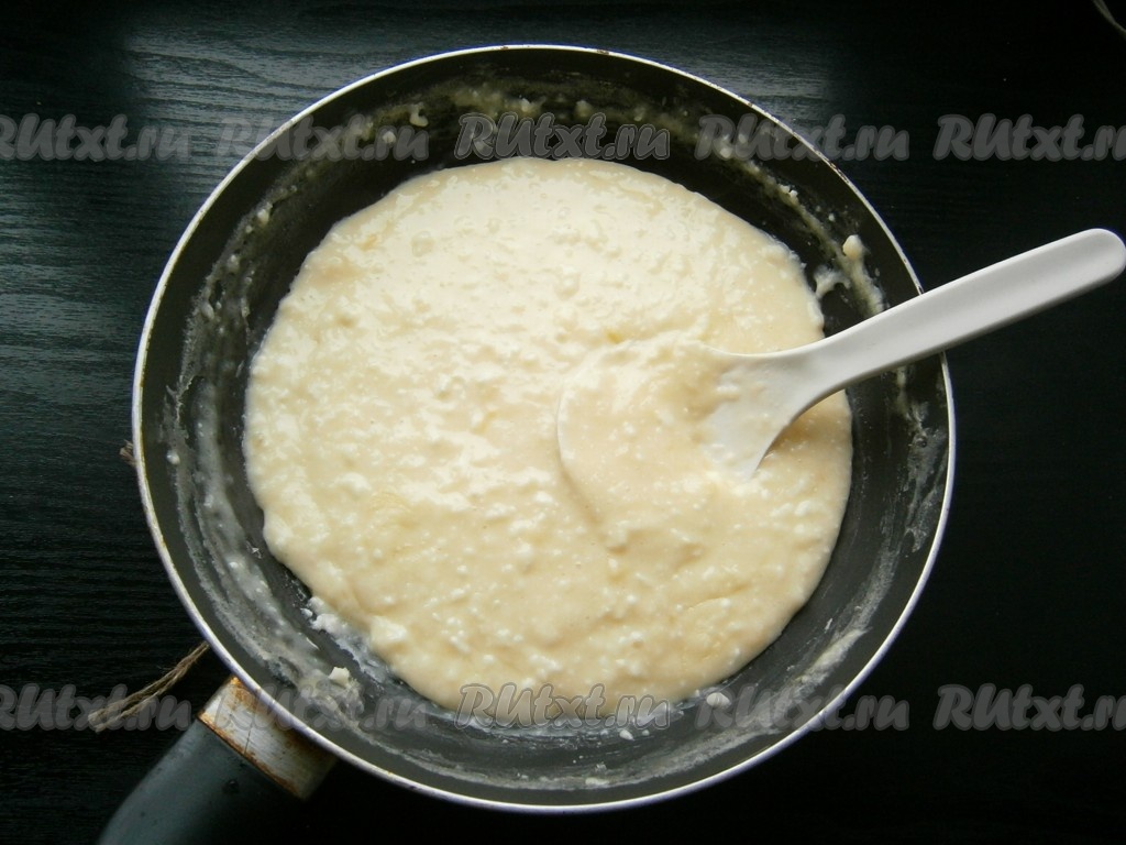 Далее перемешивать массу следует постоянно, пока не получится почти однородная тягучая смесь. Для этого понадобится минут 5-7. По идее, смесь должна быть полностью однородной и гладкой, но бывает, что остаются небольшие творожные вкрапления - на вкус это совершенно не влияет.