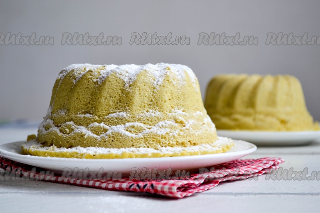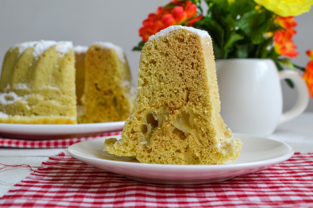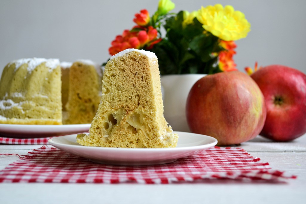 По желанию, нежную и воздушную шарлотку с яблоками, приготовленную в микроволновке, можно посыпать сахарной пудрой или покрыть глазурью.