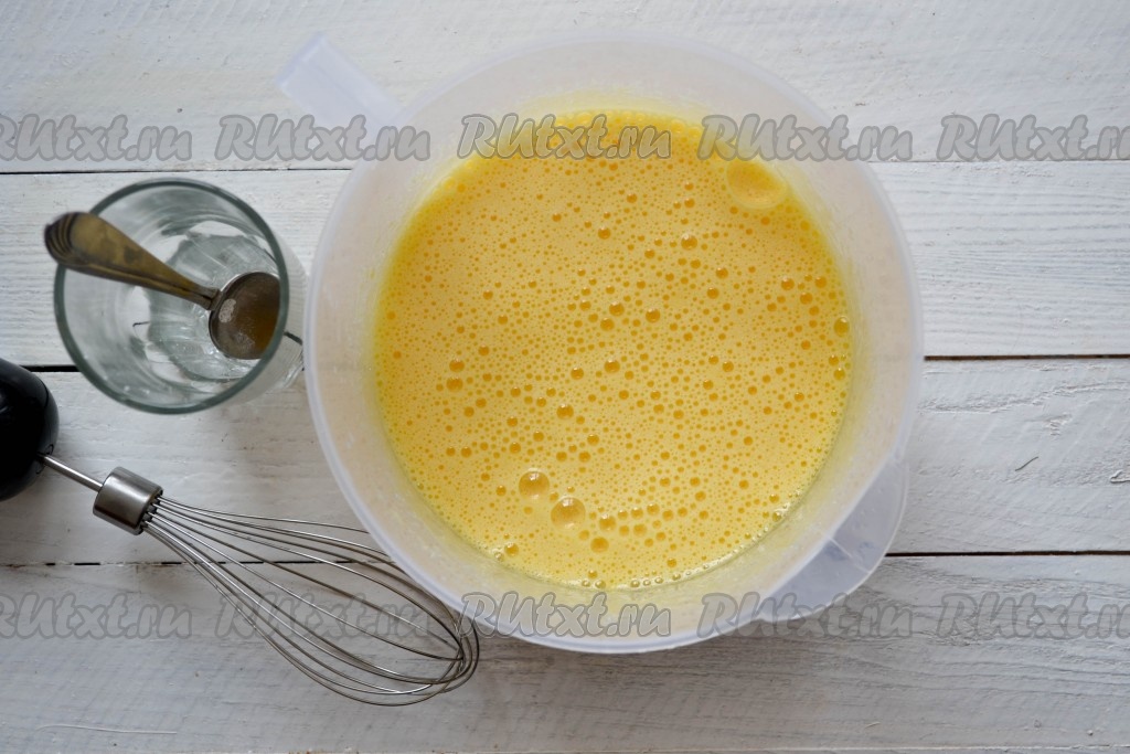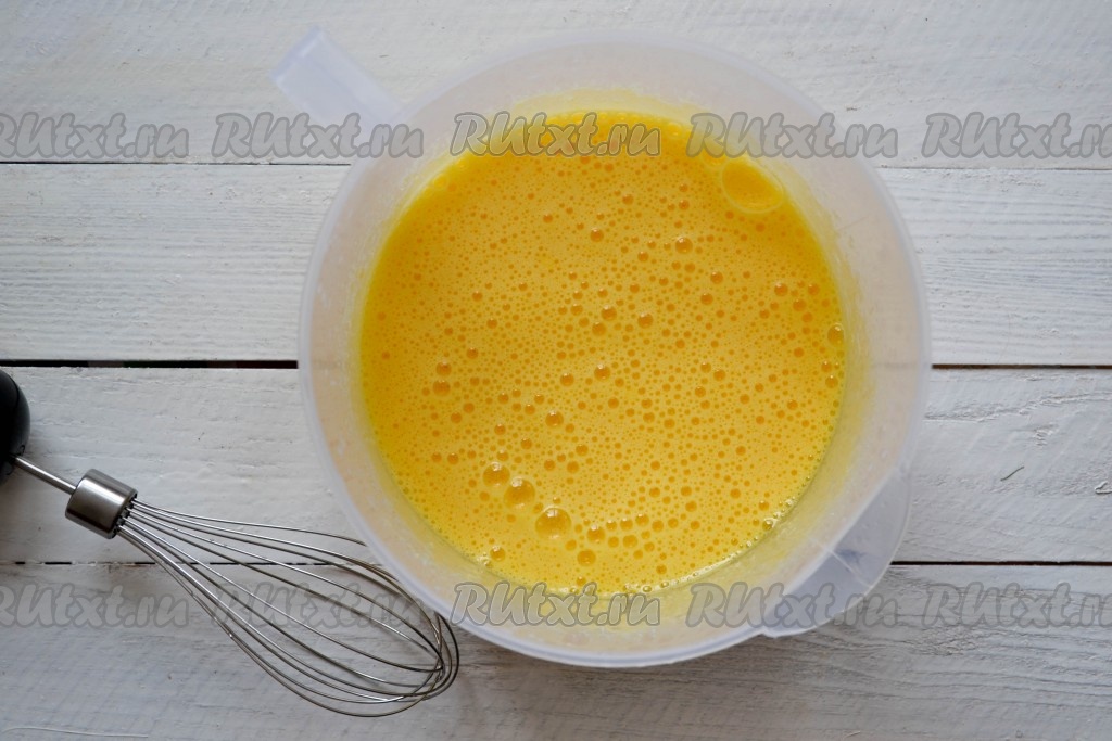 Яйца разбить в глубокую миску и, на высоких оборотах миксера, взбить до однородной, пышной массы. Взбивать на протяжении 2-3 минут.