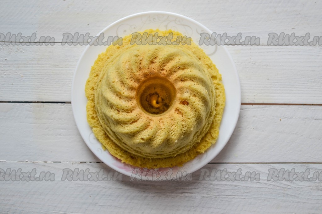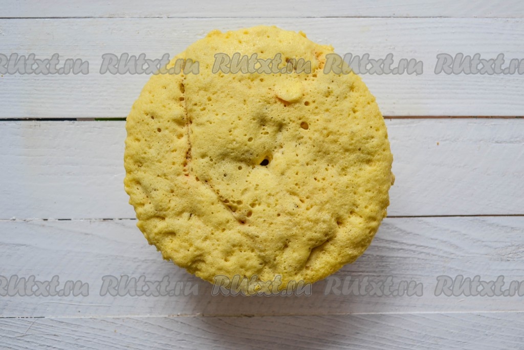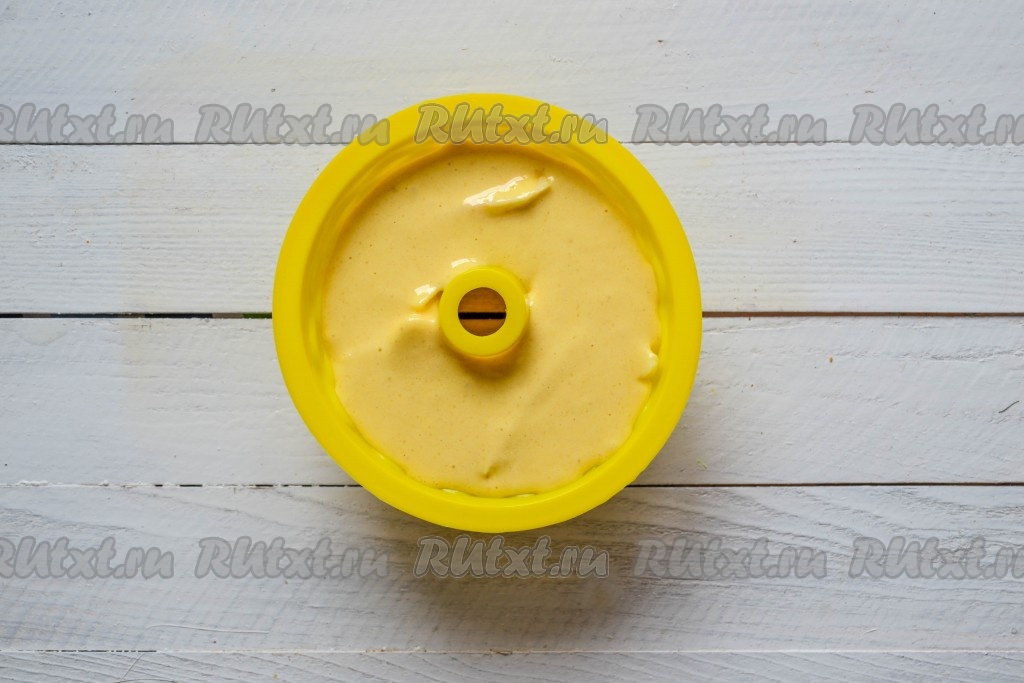 Сверху влить тесто, не доходя 1,5-2 см до верха формы, и отправить в микроволновку.