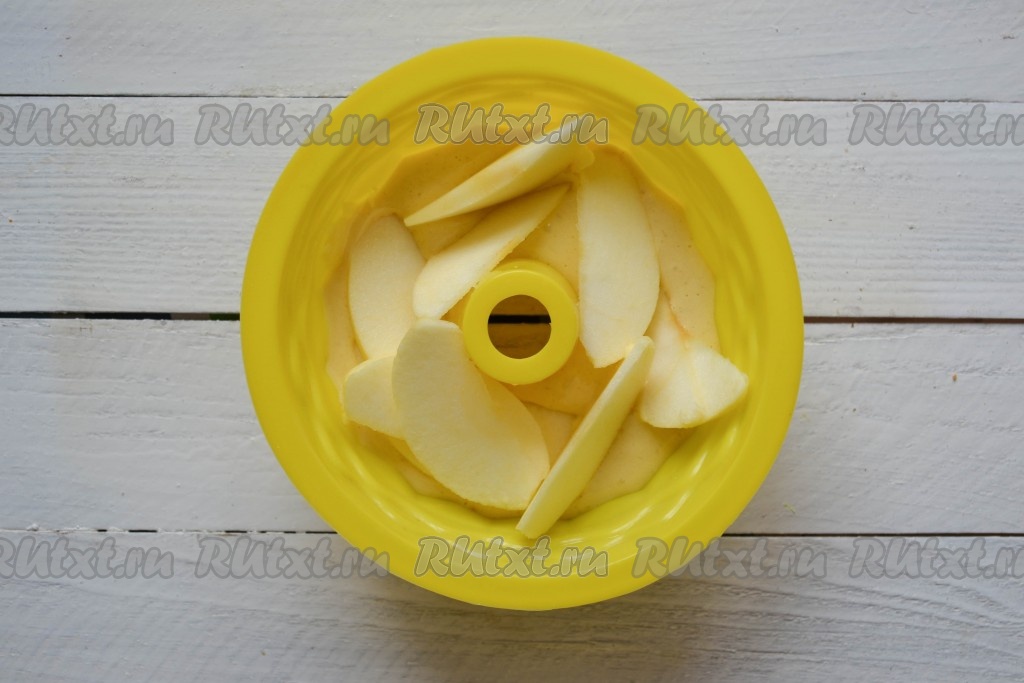 Заполнить тестом половину формы. Я использовала силиконовую форму (объем 500 мл) и ее ничем не смазывала. Можно воспользоваться любой посудой, предназначенной для микроволновой печи, и смазать ее растительным маслом. Яблоки очистить от кожуры, нарезать тонкими ломтиками и выложить поверх теста.