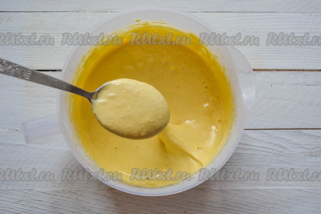 И снова перемешать. Тесто получится густым и тянущимся. Если набрать его в ложку, а затем ложку повернуть, то тесто станет медленно-медленно, широкими лентами сползать вниз.