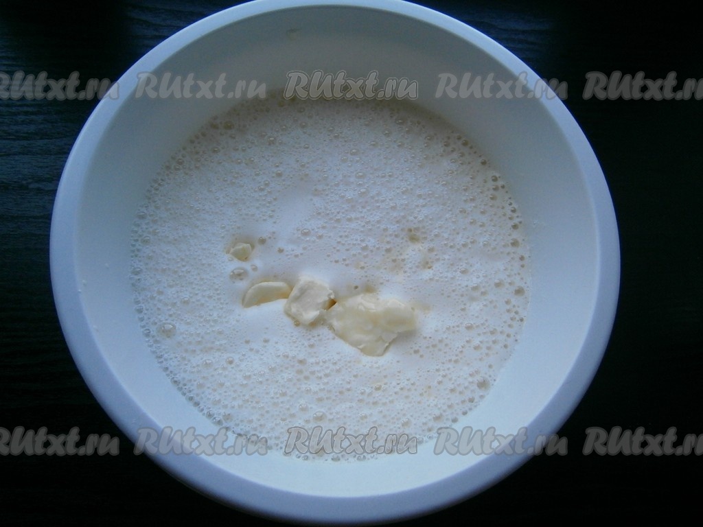 Влить в получившуюся смесь теплое молоко, добавить размягченное сливочное масло.