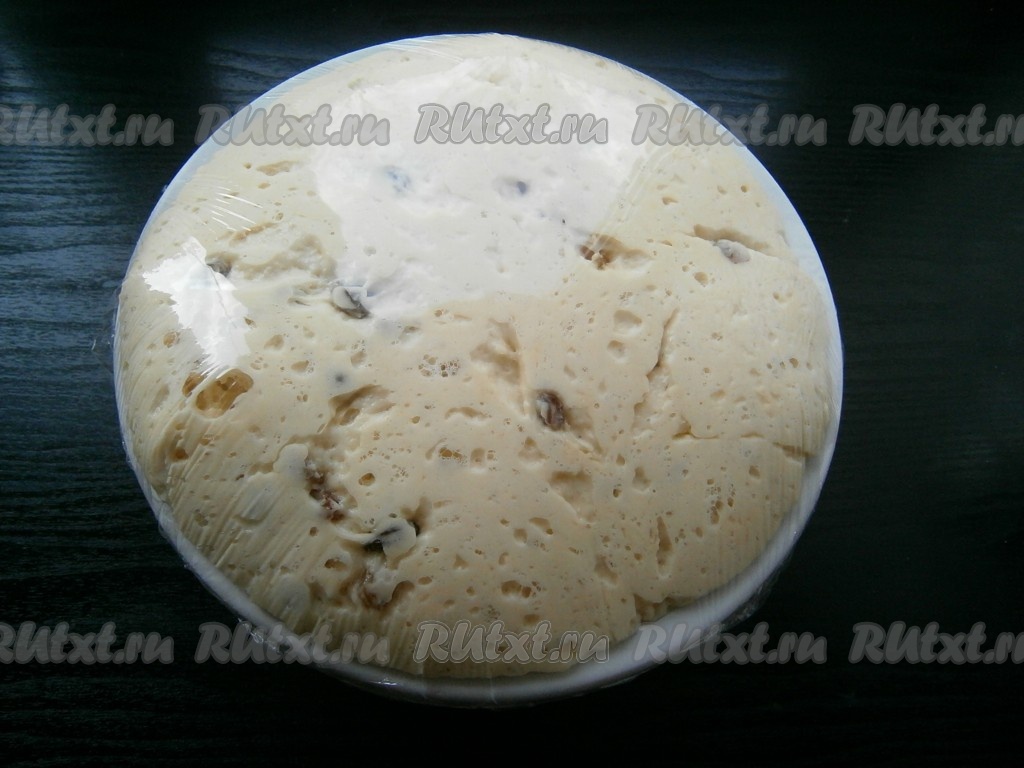 Накрыть посуду с тестом пленкой и оставить его в теплом месте на 2-2,5 часа. Тесто будет подходить медленно, но в итоге должно увеличиться раза в 2-3.
