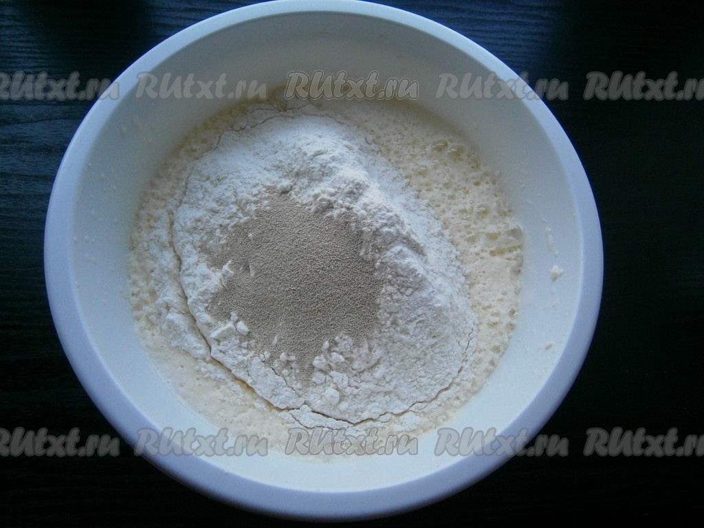 Еще раз взбить миксером до однородности, после чего всыпать 600 грамм муки и дрожжи.