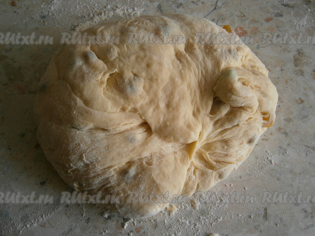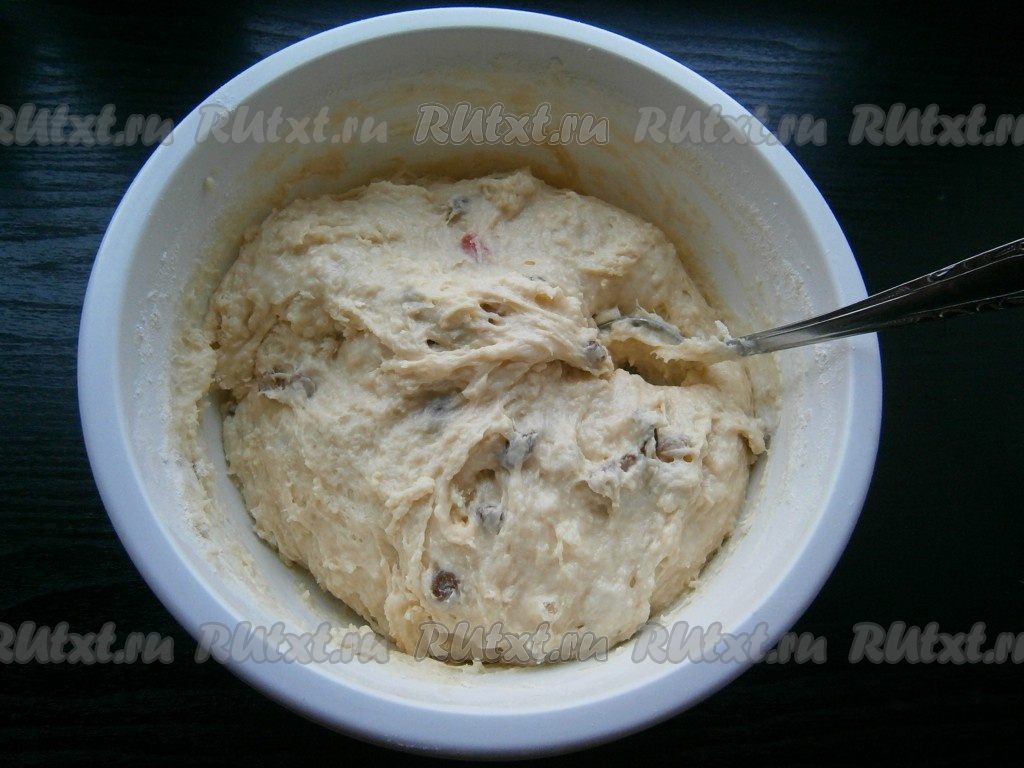 Замесить тесто ложкой. Оно будет довольно густым, плотным и тяжелым. Добавить в тесто немного присыпанный мукой изюм и цукаты.