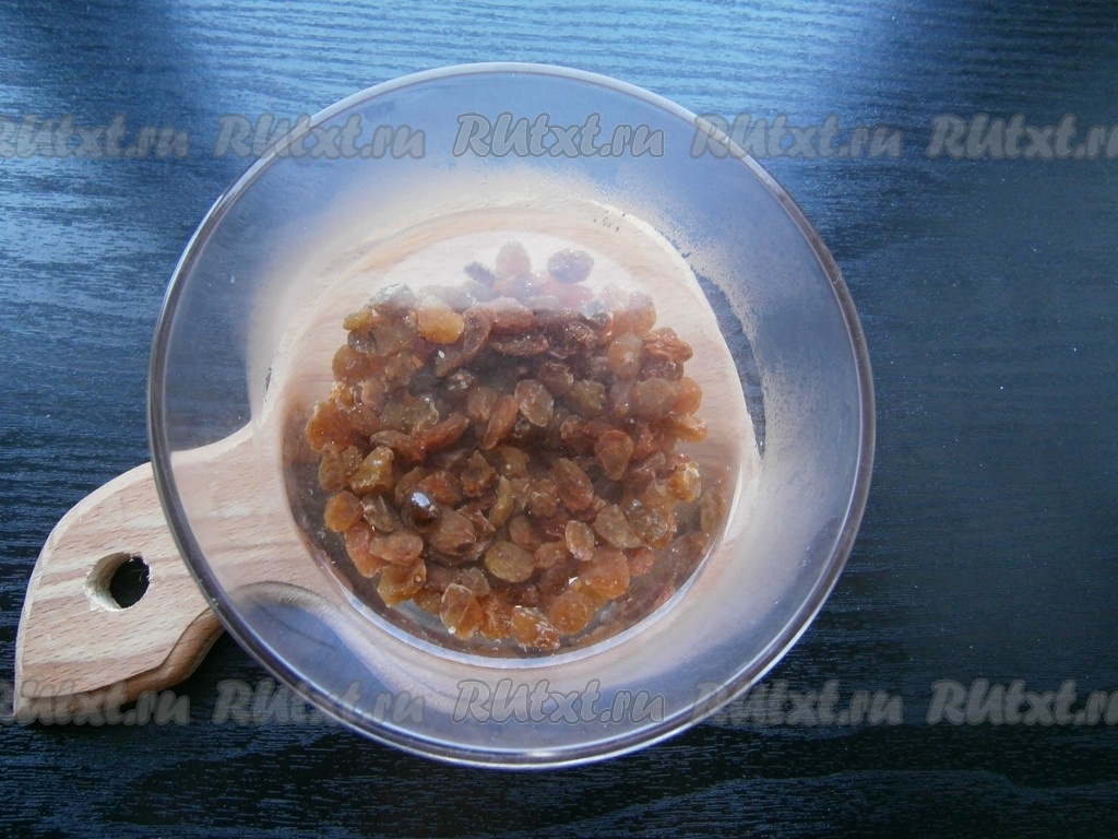 Изюм замочить в горячей воде на 15 минут, затем воду слить, изюм обсушить.