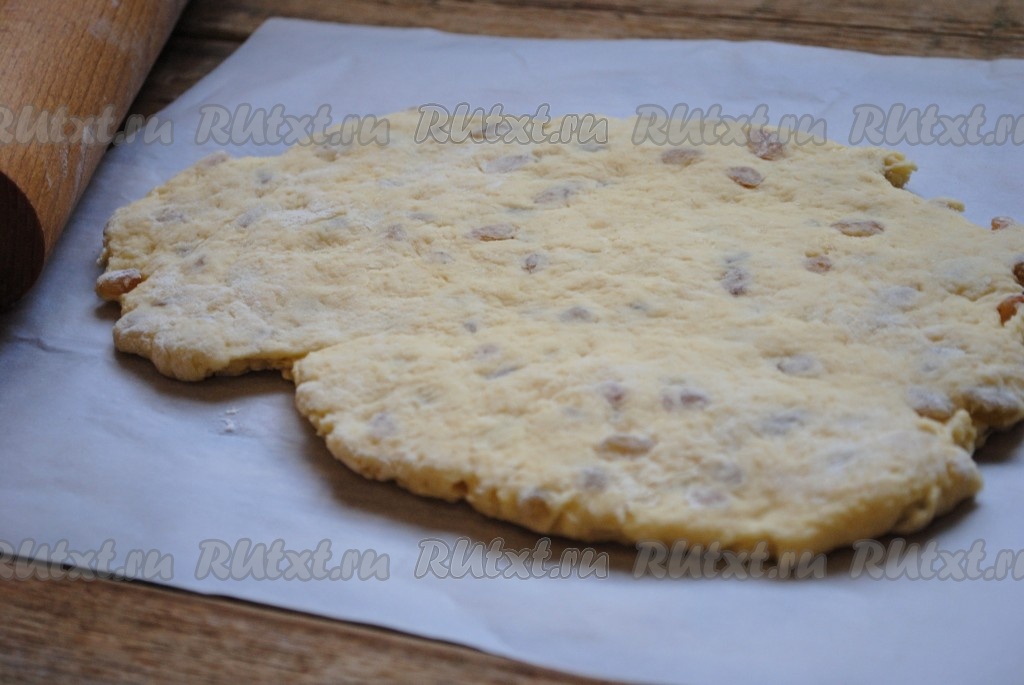 Готовое тесто раскатать в пласт толщиной 2 см. Поверхность, на которой будете раскатывать, нужно притрусить мукой.
